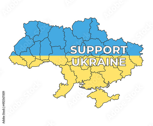 Vector illustration of map of Ukraine with a flag of Ukraine. Banner for Ukraine support. No to war. Stand with Ukraine, help Ukrainian.