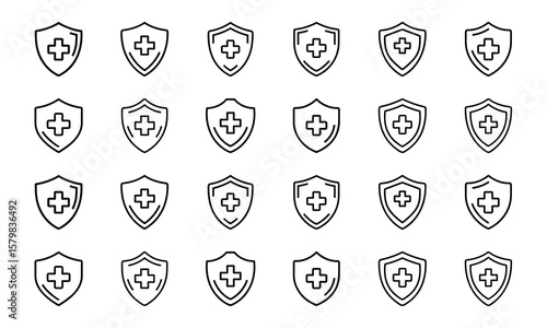 Vector illustration of medical cross shield icons representing health safety and protection in modern linear design