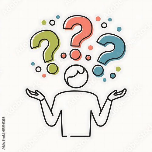 Vector Illustration of Minimalist Human Figure in Shrugging Pose with Colorful Question Marks and Playful Dots