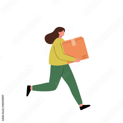 Vector illustration of person running with box urgent delivery on white background