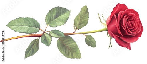Vector illustration of red rose, isolated on white background, green leaves and stem, detailed.