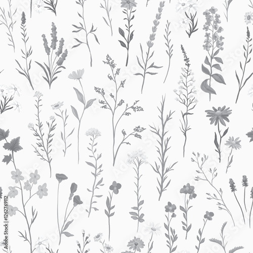 vector illustration of Seamless monochrome pattern with various wildflowers and delicate plants