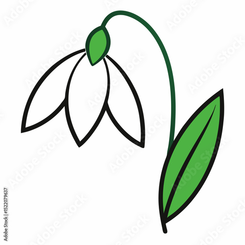 Vector illustration of snowdrop with green leaf.