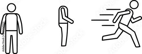 Vector illustration of three simple line art icons of people standing, side profile, and running isolated on white background