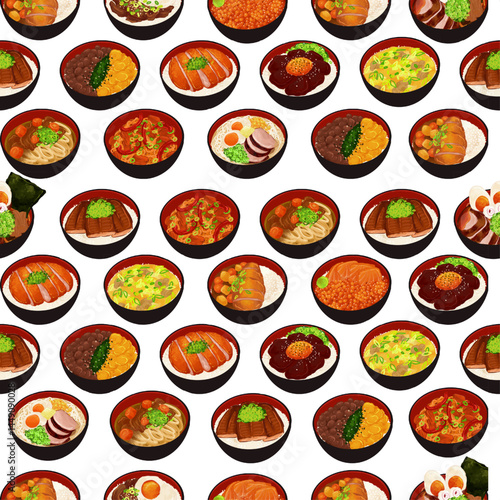 Vector illustration of traditional Japanese food featuring ramen and assorted sushi seamless pattern
