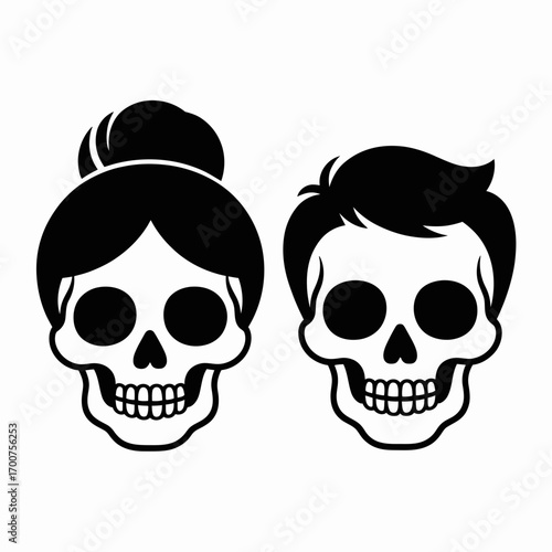 Vector illustration of two stylized skulls male and female black silhouette scalable graphic white background