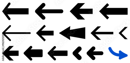 Vector illustration of various bold left-pointing arrow icons in black and blue, featuring clean, modern designs.