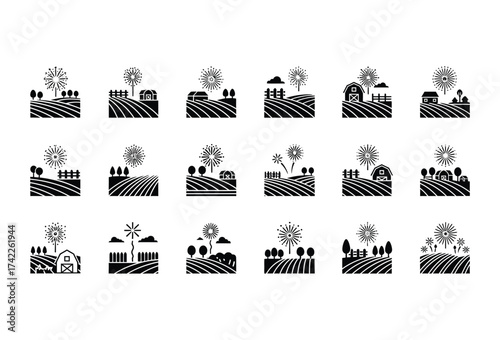 Vector illustration of vector art of set of black and white icons showing farming and agricultural activities