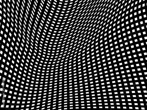 Vector illustration of wavy black and white square pattern with a grid distortion effect that creates a dynamic optical illusion in op art style.