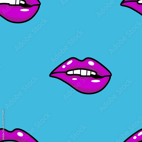 Vector illustration pattern with mouths covered pink lipstick on a blue background