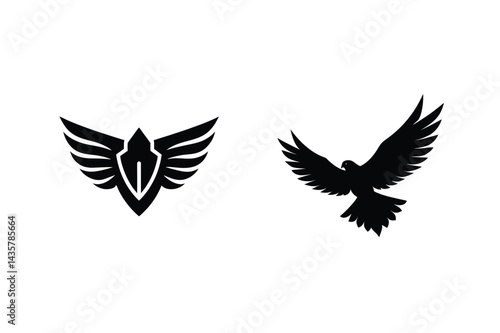 Vector Illustration Set Featuring Flying Bird And Winged Shield Logo Designs