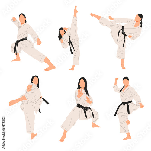 Vector illustration set of six female karate athletes in black belt performing martial arts stances, punches, and kicks. Perfect for combat sports, self-defense, and fitness design.