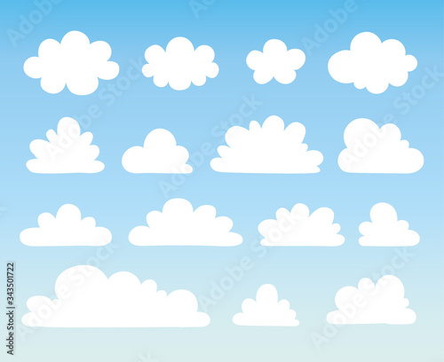 Vector illustration with a collection of white clouds on a blue background.