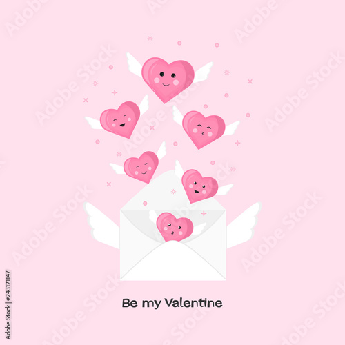 Vector illustration with letter, funny hearts and inscription "Be my Valentine". For invitations, Valentine or wedding greeting cards, template for poster, banner, decoration design, t-shirt print.