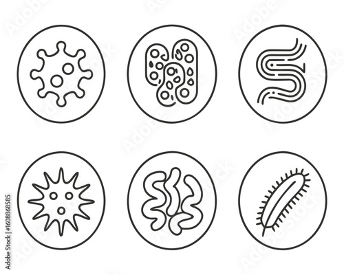 Vector illustrations of various microorganisms within circular frames in minimalist style.