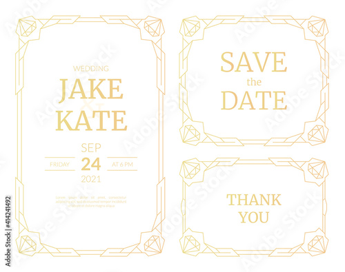 Vector illustrations set of luxury wedding invitation cards with gold gradient. Gold frame. Line art deco vintage geometric pattern wedding template for save the date cards with jewelry stone corners