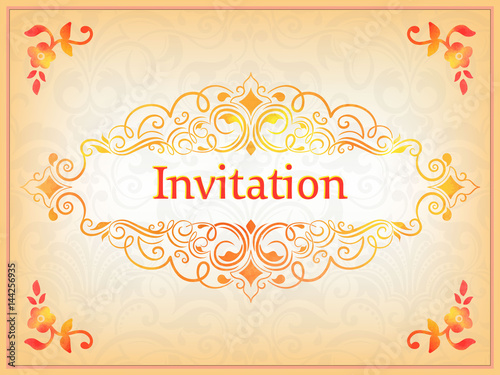 Vector invitation card with watercolor damask element on the light damask background. Arabesque style design. Elegant invitation or gift card.