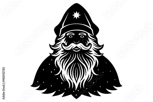 Vector isolated Santa Claus Father Christmas Saint Nicolas head face portrait stencil colorless black and white outline silhouette shadow shape