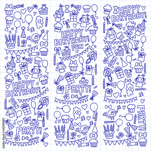 Vector kids party Notepad paper Children birthday icons in doodle style Illustration with children, candy, balloon, boys, girls