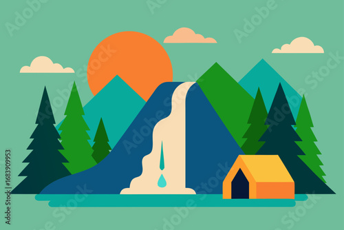 Vector landscape illustration with mountains, trees, and a house, with a vibrant summer sky