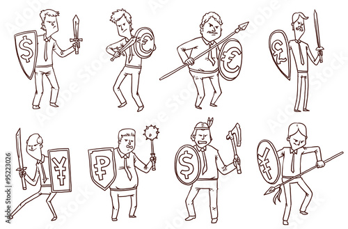 Vector line cartoon image of the eight men in the office dressed with shields with different currencies signs on them and with various melee weapons in the hands on a white background.