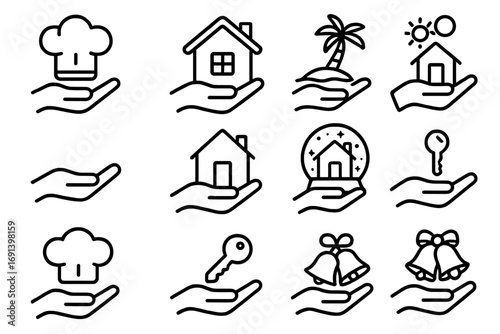 Vector line icon set with hands offering services. Includes real estate, culinary, travel, and holiday concepts. Outline symbols of house, key, chef hat, vacation, celebration.