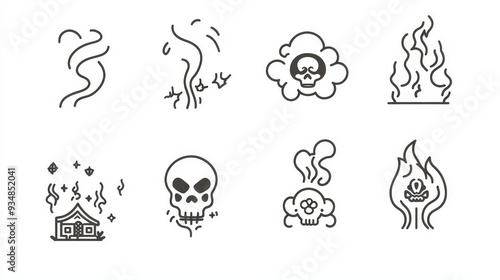 Vector line icons representing smell, including smoke, steam, and nose detecting odors. Features symbols for bad smells, stinky odors, toxic fumes, and smoke with skull icons for hazardous or noxious