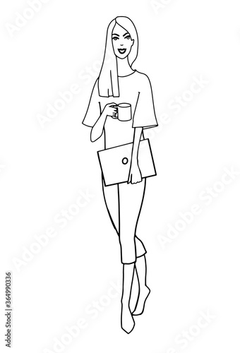 Vector line stand woman work at home with laptop concept. Freelance peaple illustration. Hand drawn line person sketch. Home office business cartoon, happy outline girl. Female isolated linear art.