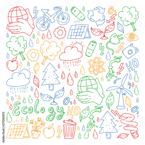 Vector logo, design and badge in trendy drawing style - zero waste concept, recycle and reuse, reduce - ecological lifestyle and sustainable developments icons.
