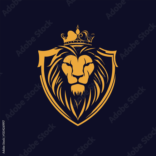 Vector logo of a lion's head with a crown on a shield, in gold color on a dark blue background
