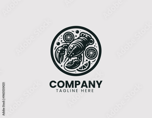 Vector logo of cooked lobster served on a plate with dipping sauce and lime. Flat cartoon food illustration for gourmet seafood branding and restaurant menu design.