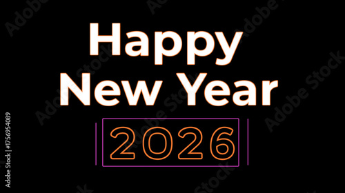 Vector logo of Happy New Year, text "Happy New Year" and numbers "2026" in white on a black background, graphic design, sticker style, purple with orange details. New year background, poster, advertis