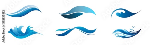 Vector logo set of ocean waves, simple shapes and lines, blue color on a white background