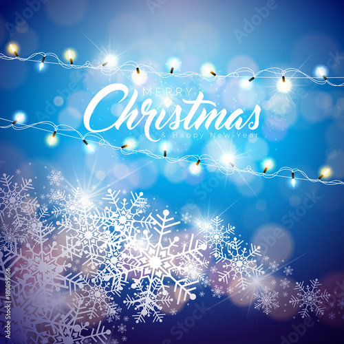 Vector Merry Christmas Illustration on Shiny Snowflake Background with Typography and Holiday Light Garland. Happy New Year Design.