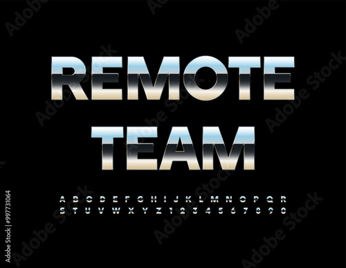 Vector metallic icon Remote Team. Reflective Steel Font. Modern Alphabet Letters and Numbers set