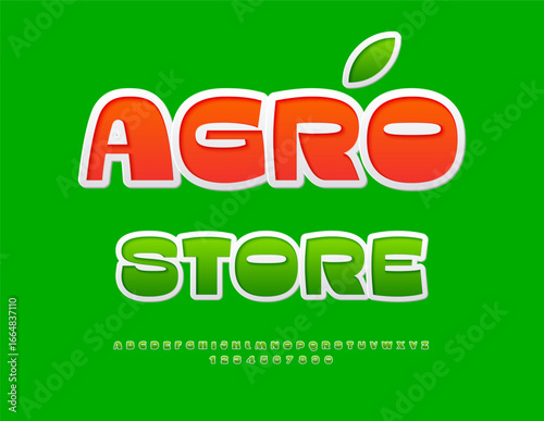 Vector Modern flyer Agro Store. Fashion Green Font. Bright Uppercase Alphabet Letters and Numbers set.