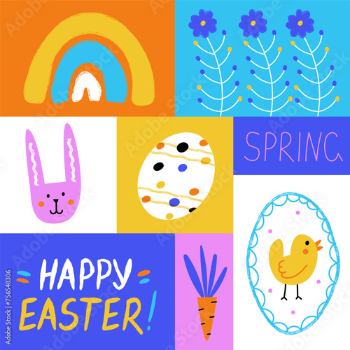 Vector modern illustration. Happy Easter poster with doodle lettering, cute bunny and easter egg in squares.