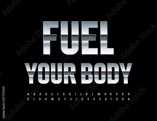 Vector motivational card Fuel Your Body with reflective steel Font. Silver Alphabet Letters and Numbers set