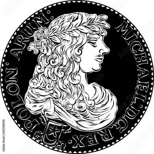 vector obverse of crown zloty by Michal Korybut Wisniowiecki, 1671 with king in laurel wreath, Black and white