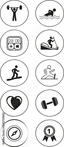 Vector of Collection of circular icons representing sports fitness health and outdoor activities.