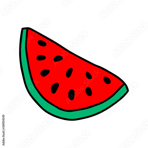 Vector outline illustration of one slice fresh red and green watermelon with black seeds isolated on a white background