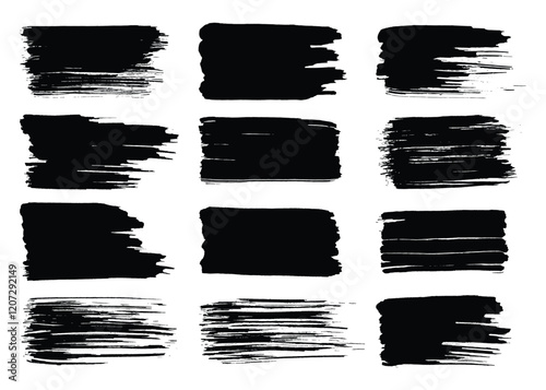 Vector paint brush set. Black ink grunge brush strokes. Grunge design elements. Painted ink stripes. Creative isolated spots. Ink smudge, abstract shape stains and smear set