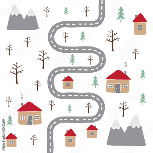 Vector pattern of hand drawn doodle flat country landscape isolated on white background