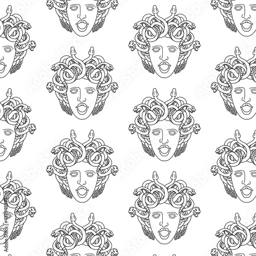 Vector pattern with hand drawn illustration of medusa Gorgon. Creative artwork with portrait. Template for card, poster, banner, print for t-shirt, pin, badge, patch.