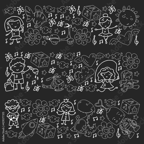 Vector pattern with boys and girls. Kindergarten and toys. Happy childhood and creativity with imagitanion.