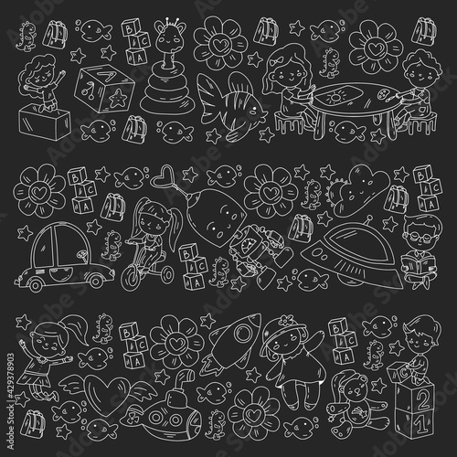 Vector pattern with boys and girls. Kindergarten and toys. Happy childhood and creativity with imagitanion.