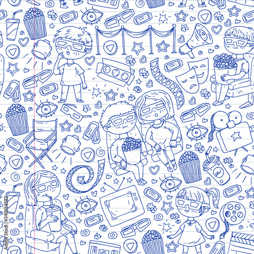 Vector pattern with cinema icons of movie theater, TV, popcorn, video clip.