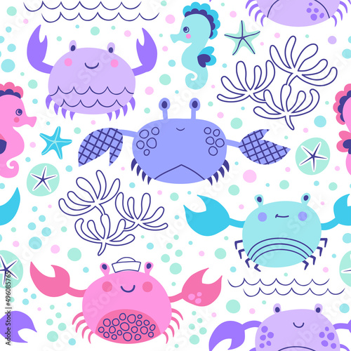 Vector pattern with crabs, starfish and seahorses. Seamless background with marine animals in trendy colors.
