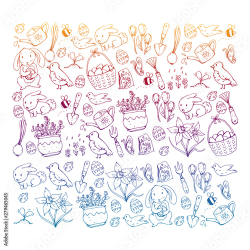 Vector pattern with easter and spring elements. Eggs in basket, bunny, flowers, birds