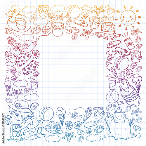Vector pattern with little chilren. Family summer vacations. Beach, ocean, island, sun. Kids play. Swimming and relaxation.